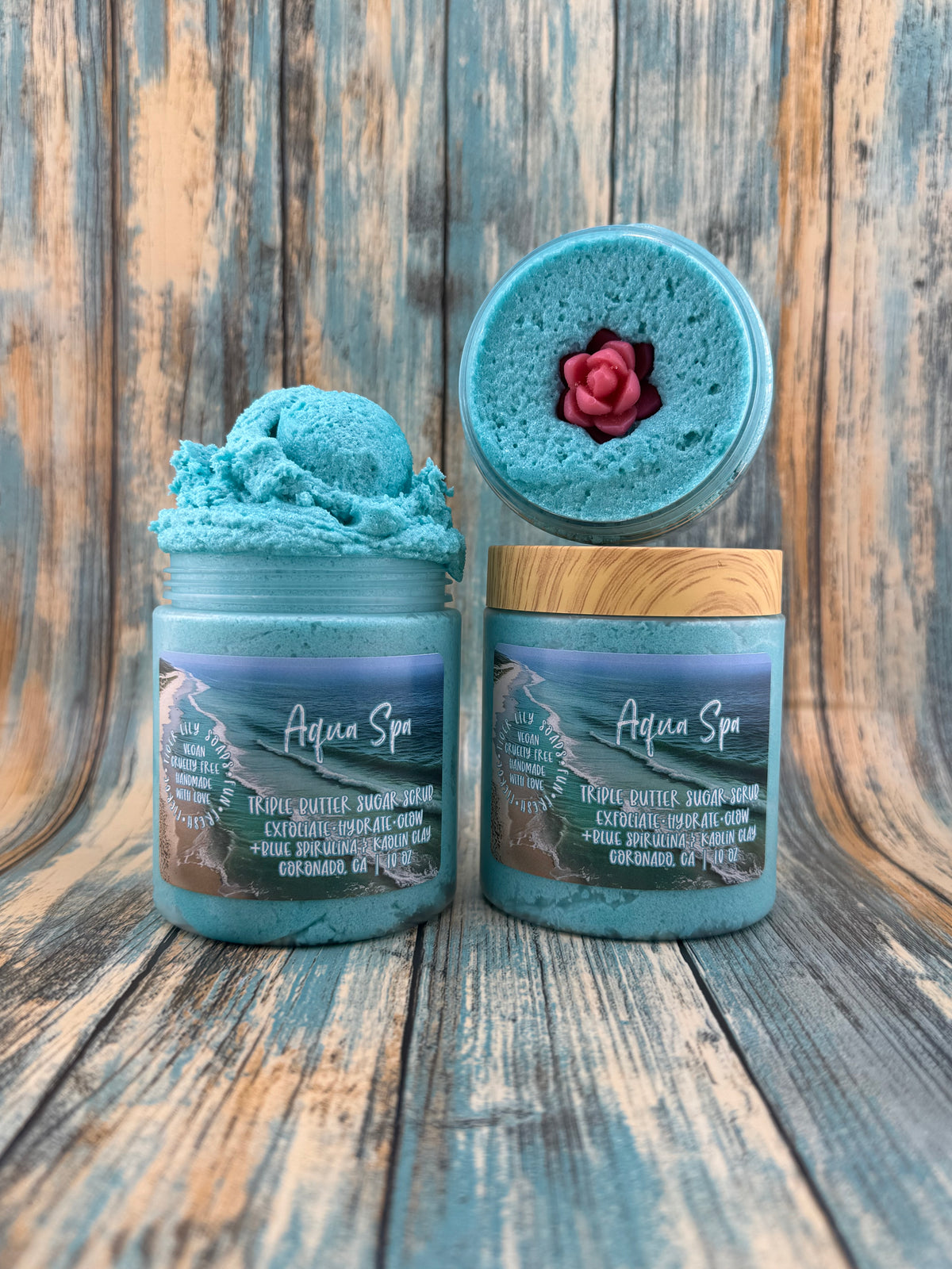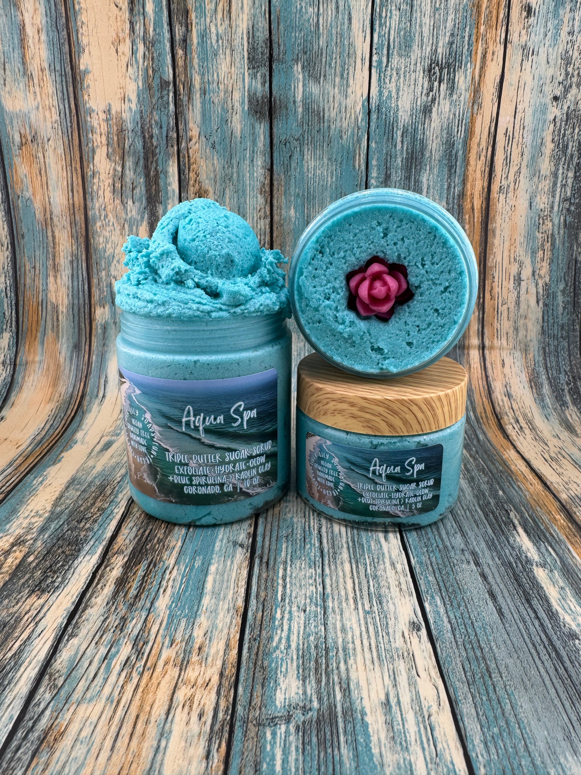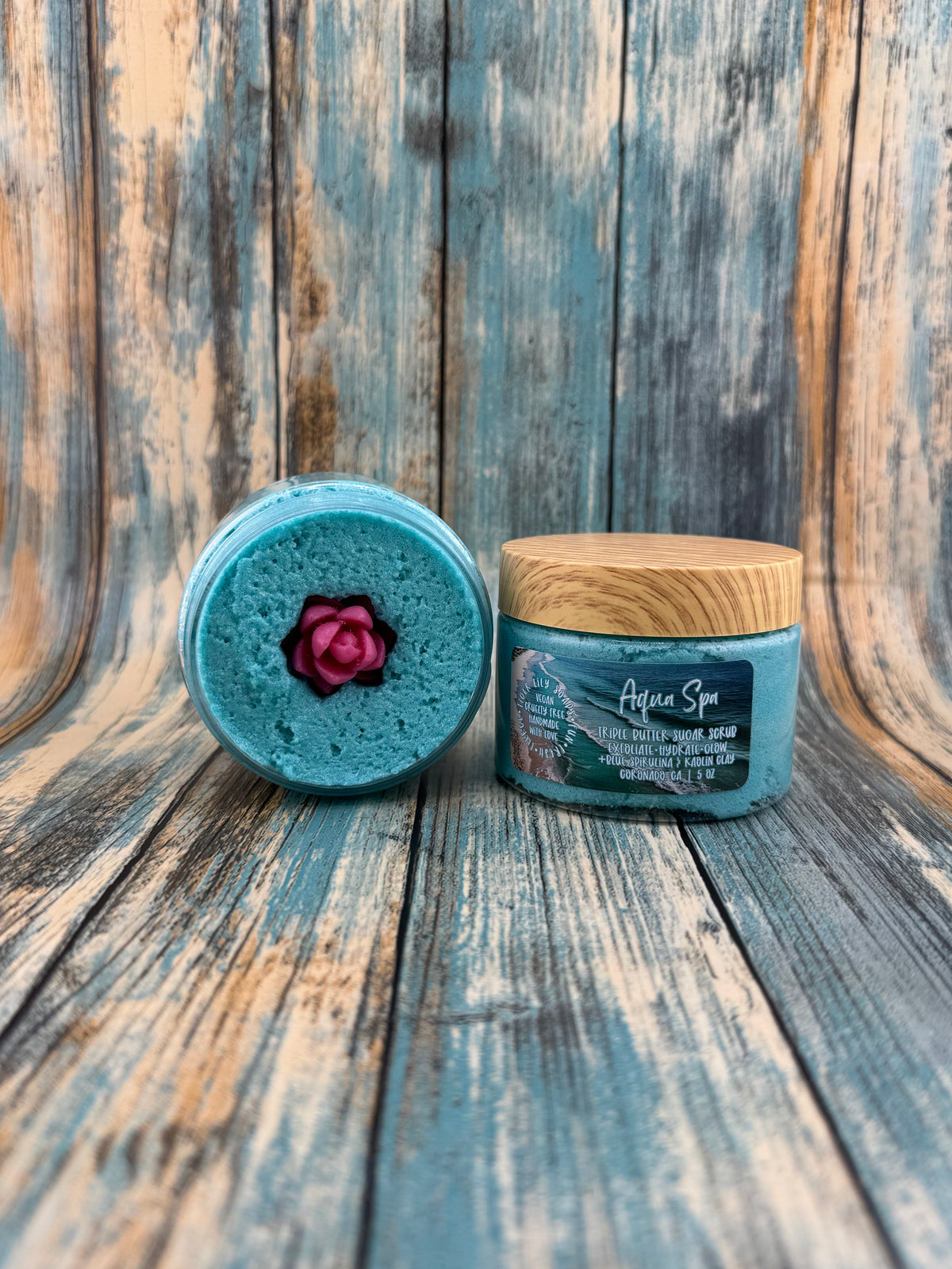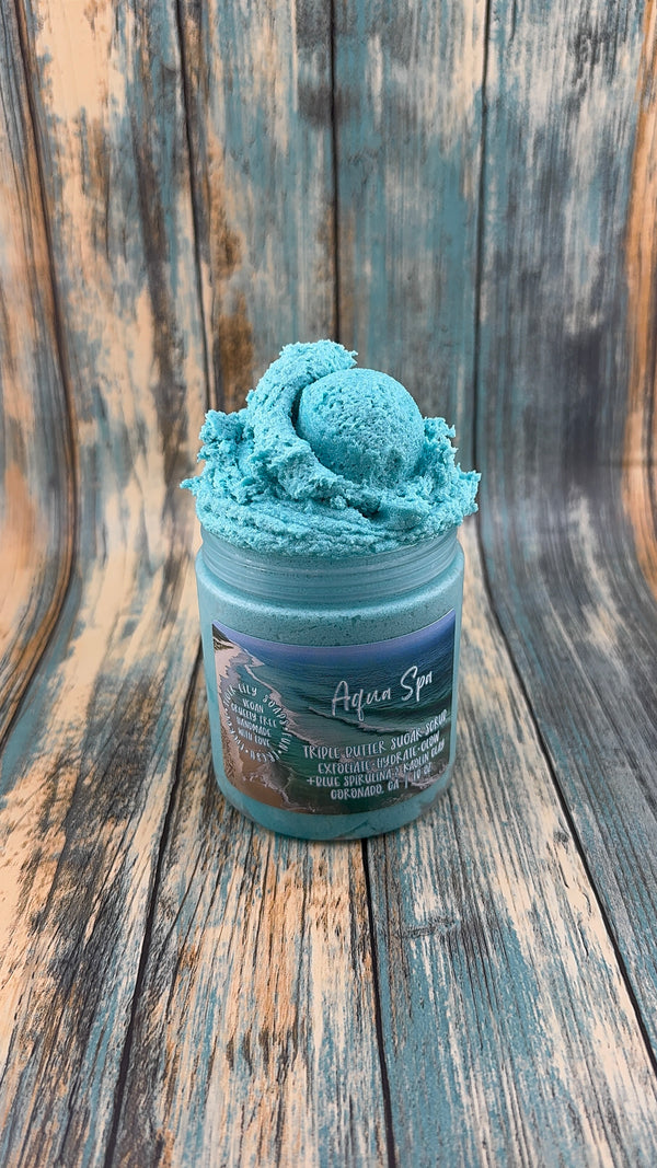 Whipped to a smooth, fluffy texture with your signature blend of shea butter & cocoa butter, plus coconut, apricot, avocado, and rosehip oils, this scrub gently exfoliates while deeply hydrating the skin. Infused with blue spirulina and kaolin clay, it detoxifies, smooths, and refreshes—leaving skin silky, balanced, and spa-soft.