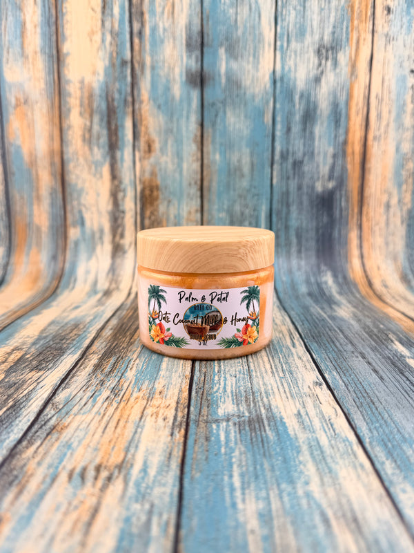 Whipped to a smooth, cloud-like texture with our signature blend of shea butter, coconut oil, apricot oil, rosehip, and avocado oil, this scrub exfoliates delicately while delivering deep, lasting moisture. Enriched with colloidal oats, real coconut milk, and raw honey, it soothes, softens, and nourishes even the most sensitive skin — leaving you silky, glowing, and irresistibly touchable.